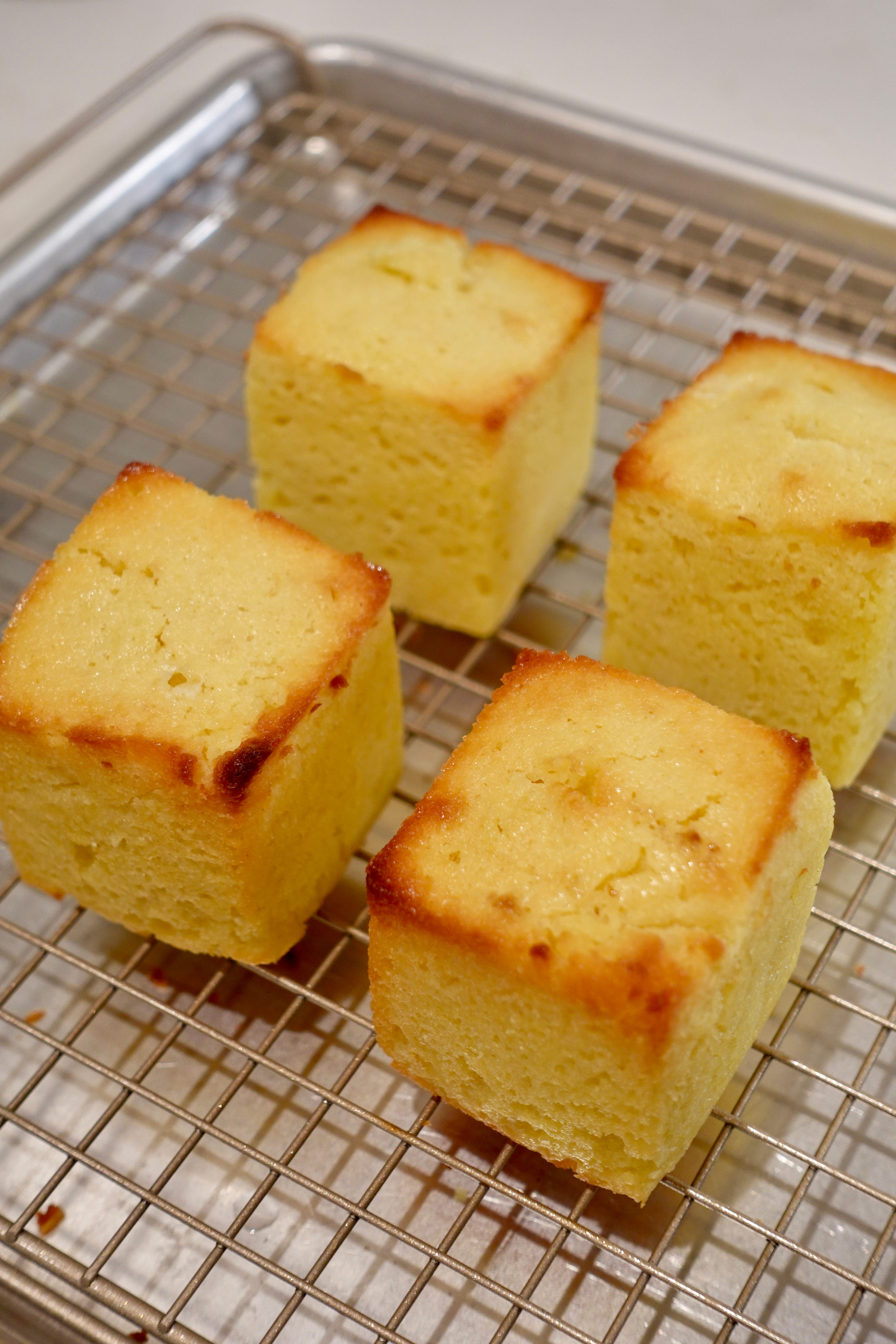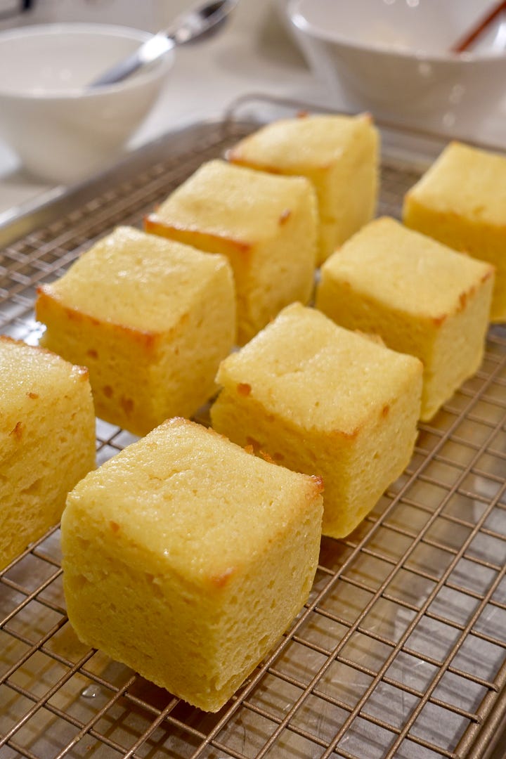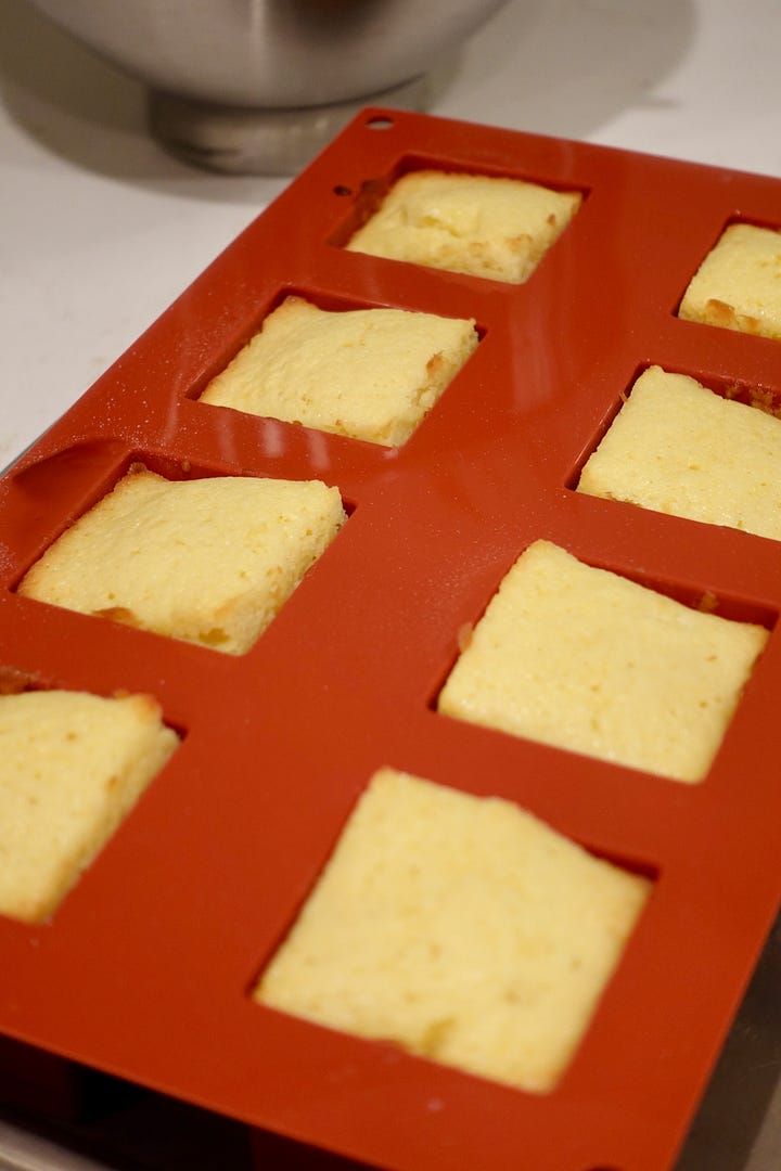 Cho’s recipe: Use the cube silicone mold, beat the eggs separately, and douse the cake in simple syrup.